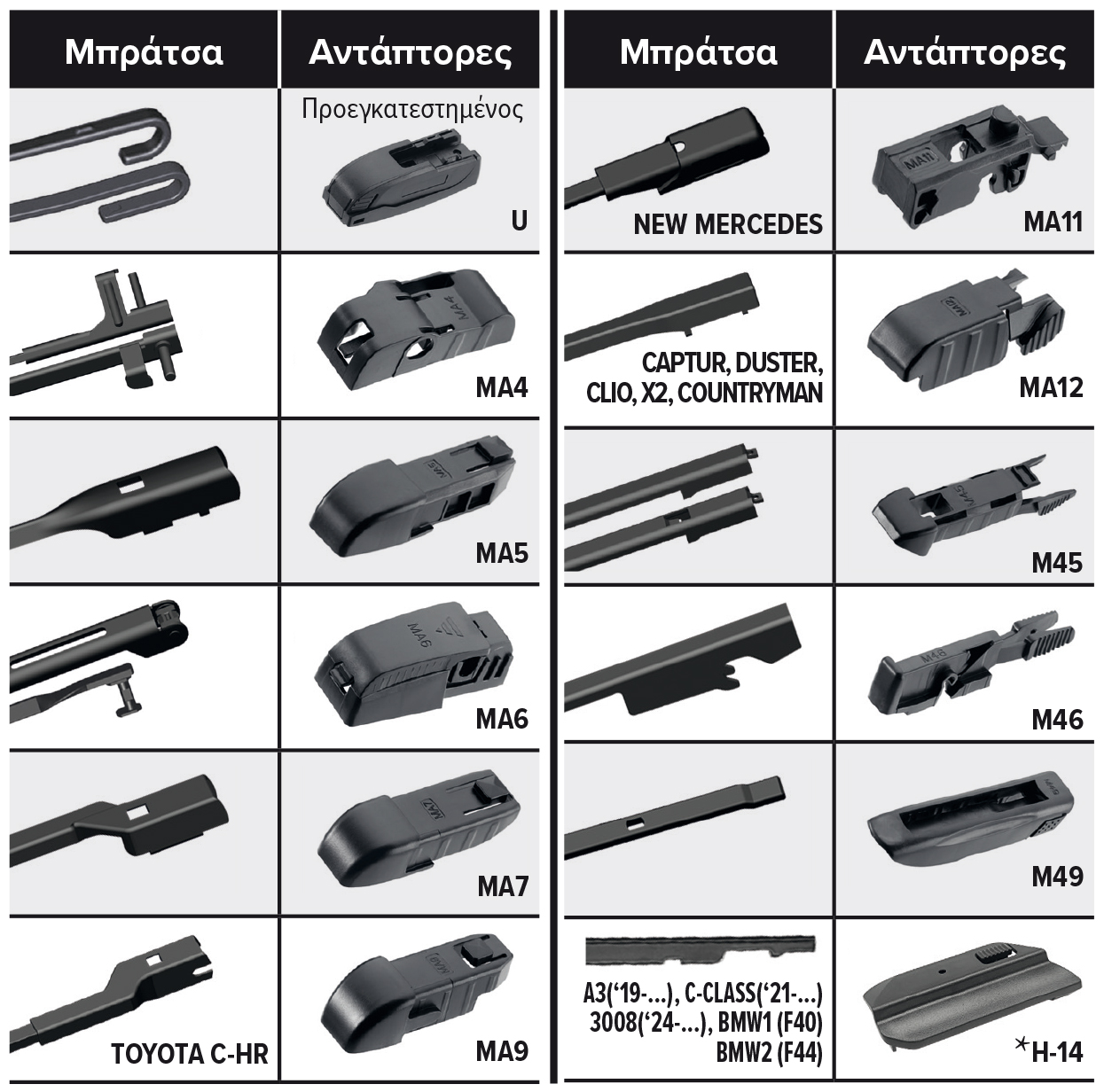 | Flat υαλοκαθαριστήρας 400 mm με 12 ανταλλακτικά για κάλυψη των μπράτσων όλων των οχημάτων